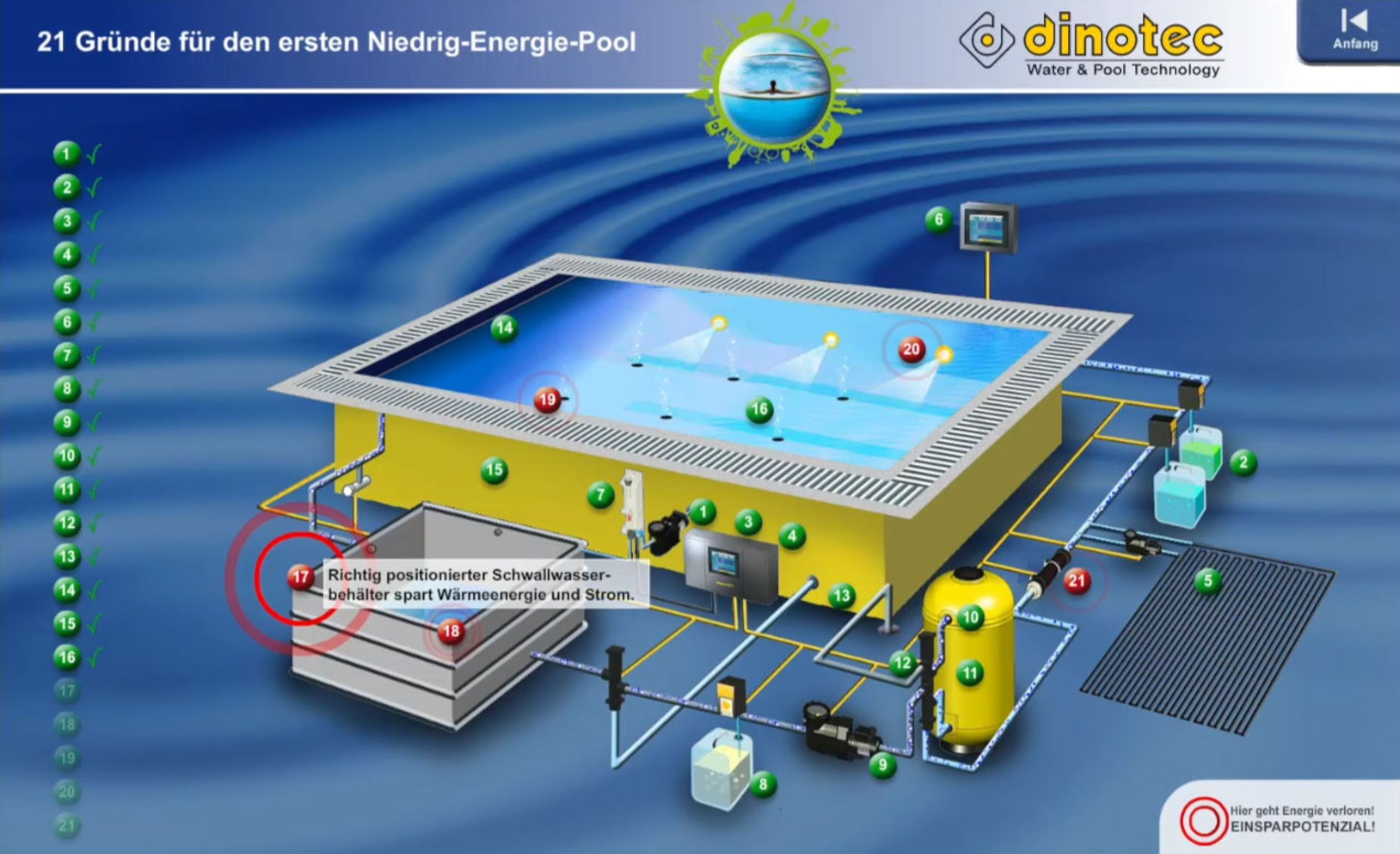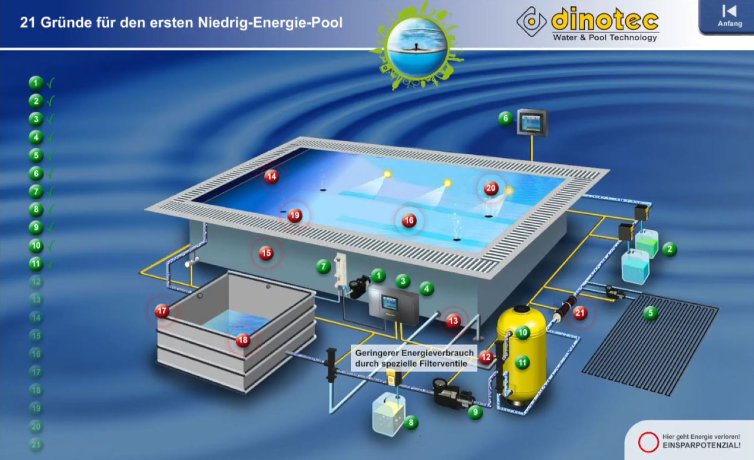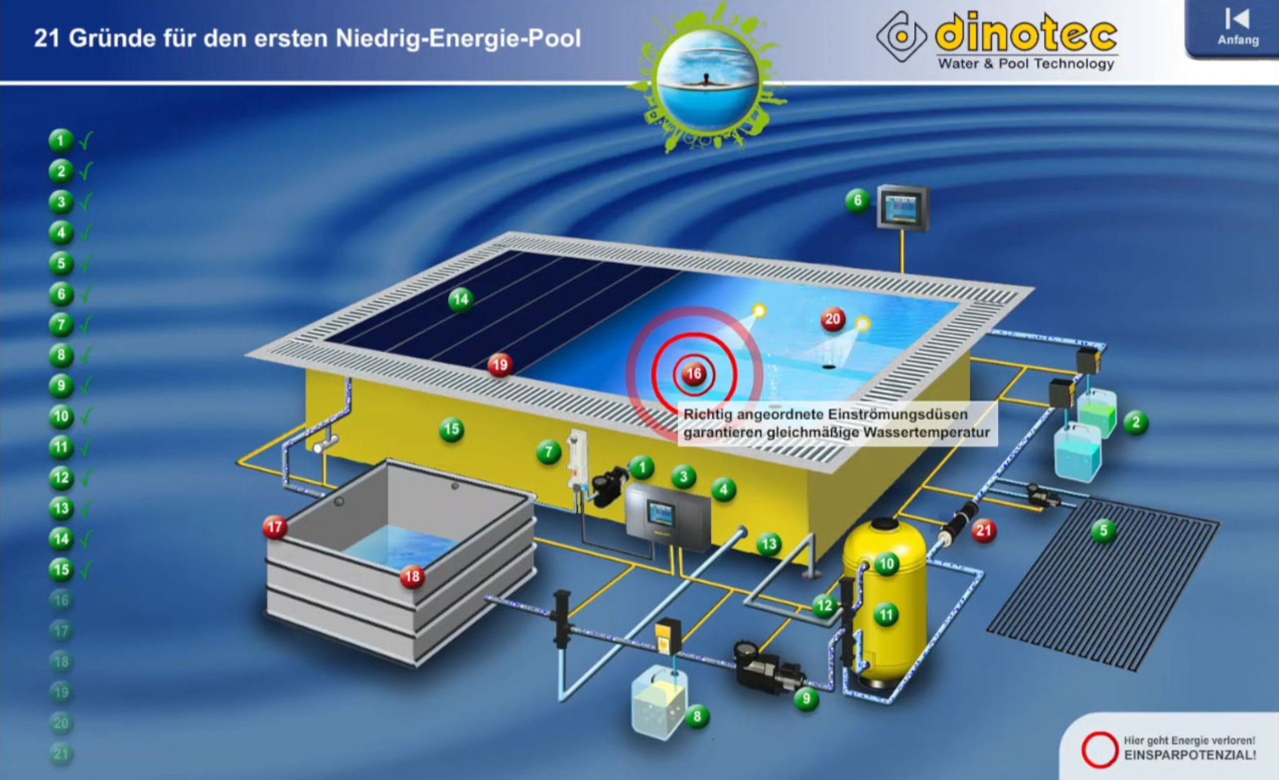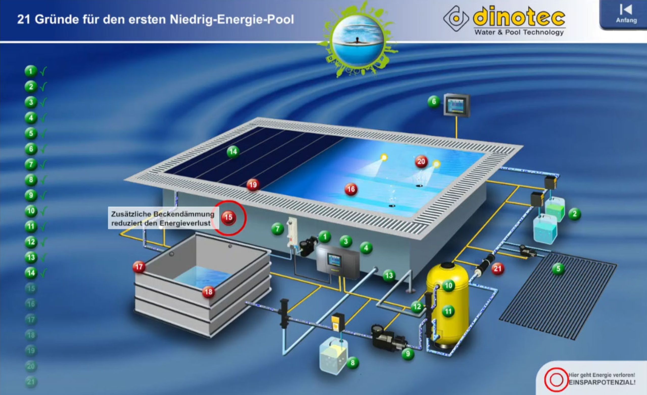 Bei herkömmlichen Pools geht eine Menge Energie verloren. Wir zeigen Ihnen, wie Sie an 21 Punkten sehr viel Energie, Wasser und Wasserpflegemittel einsparen und so zu Ihrem ersten Niedrig-Energie-Pool gelangen.
