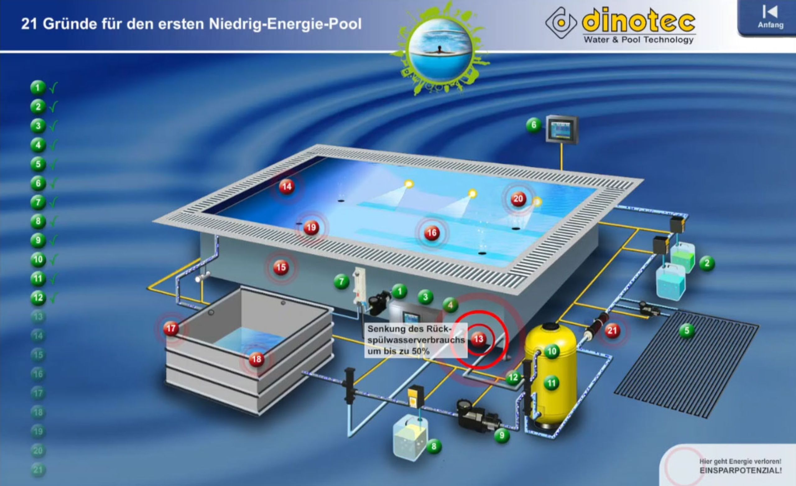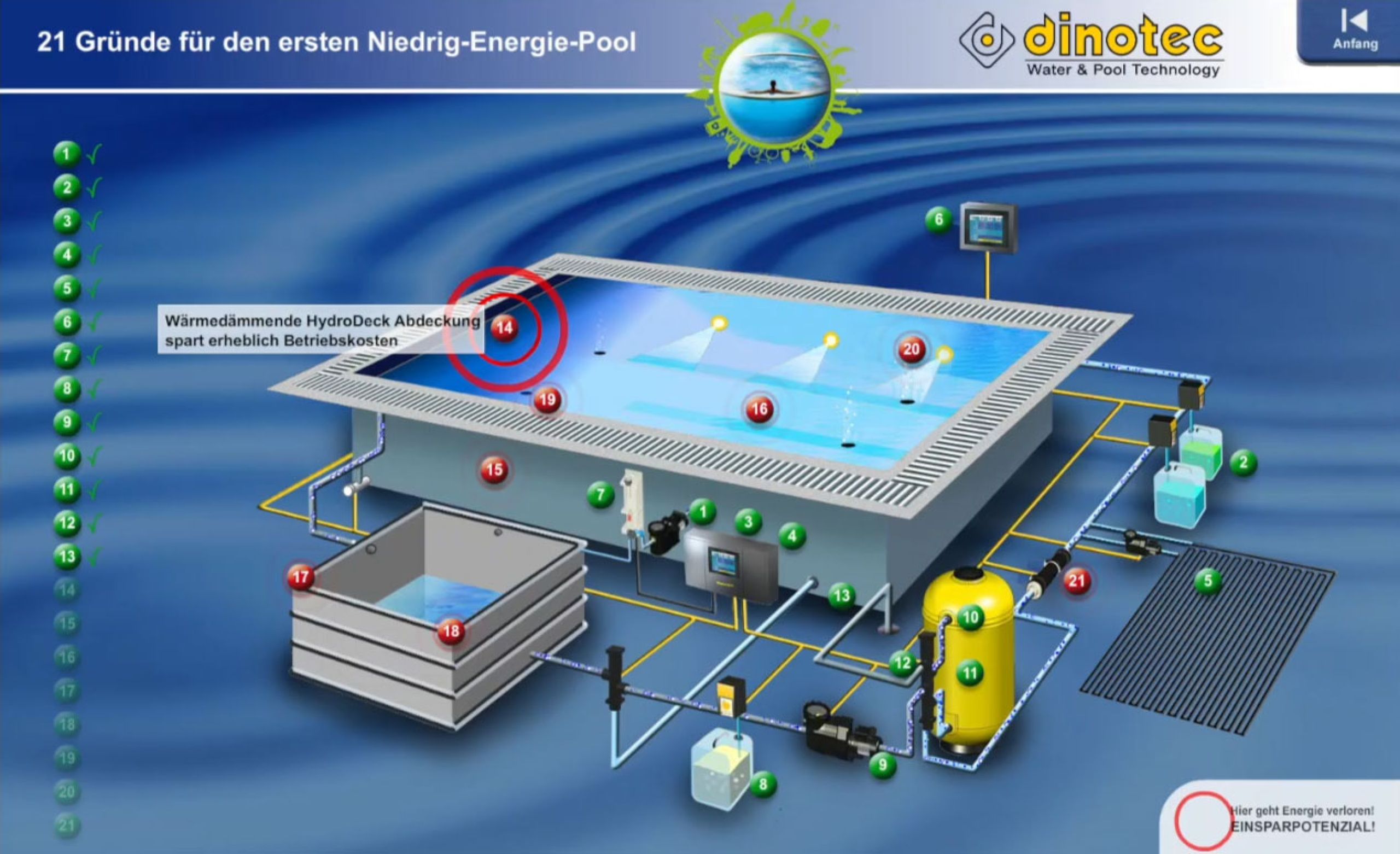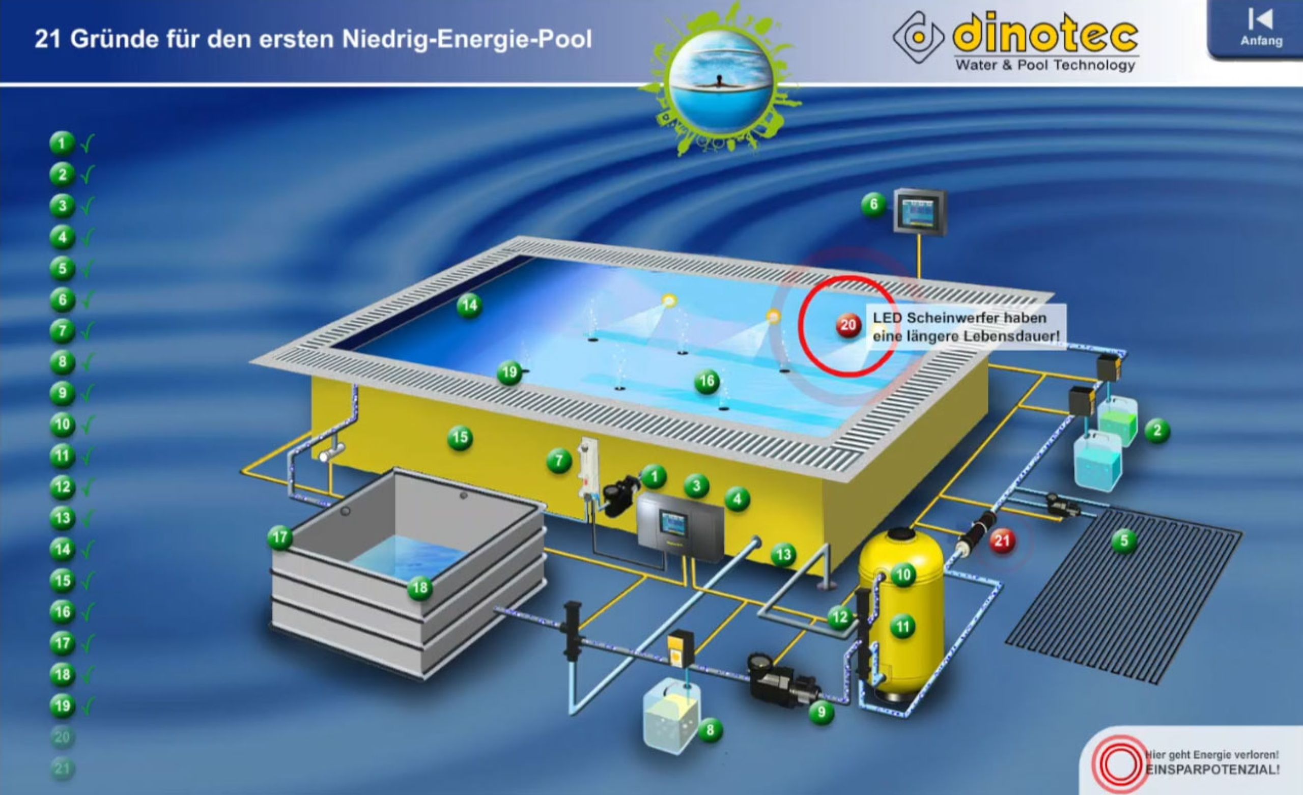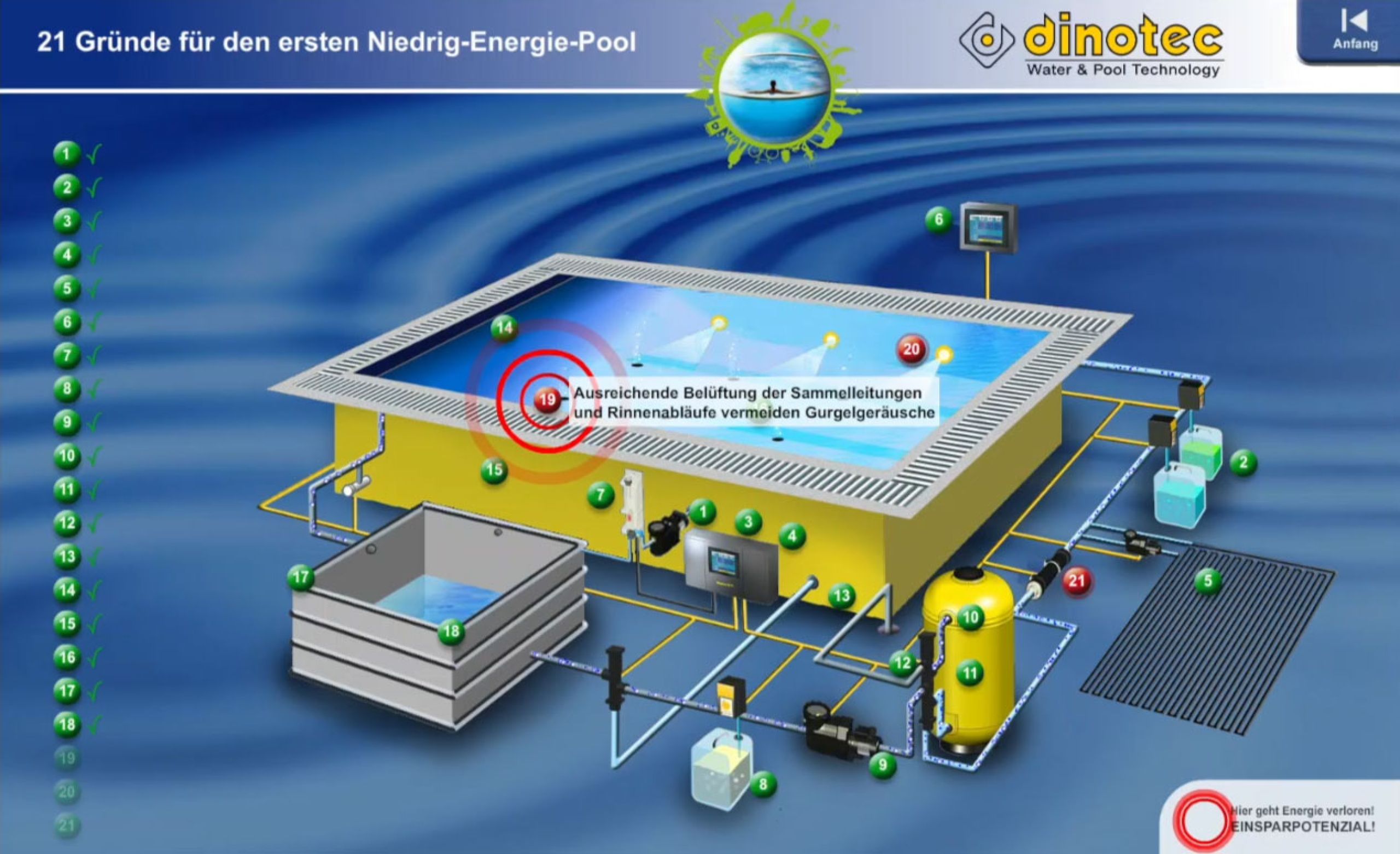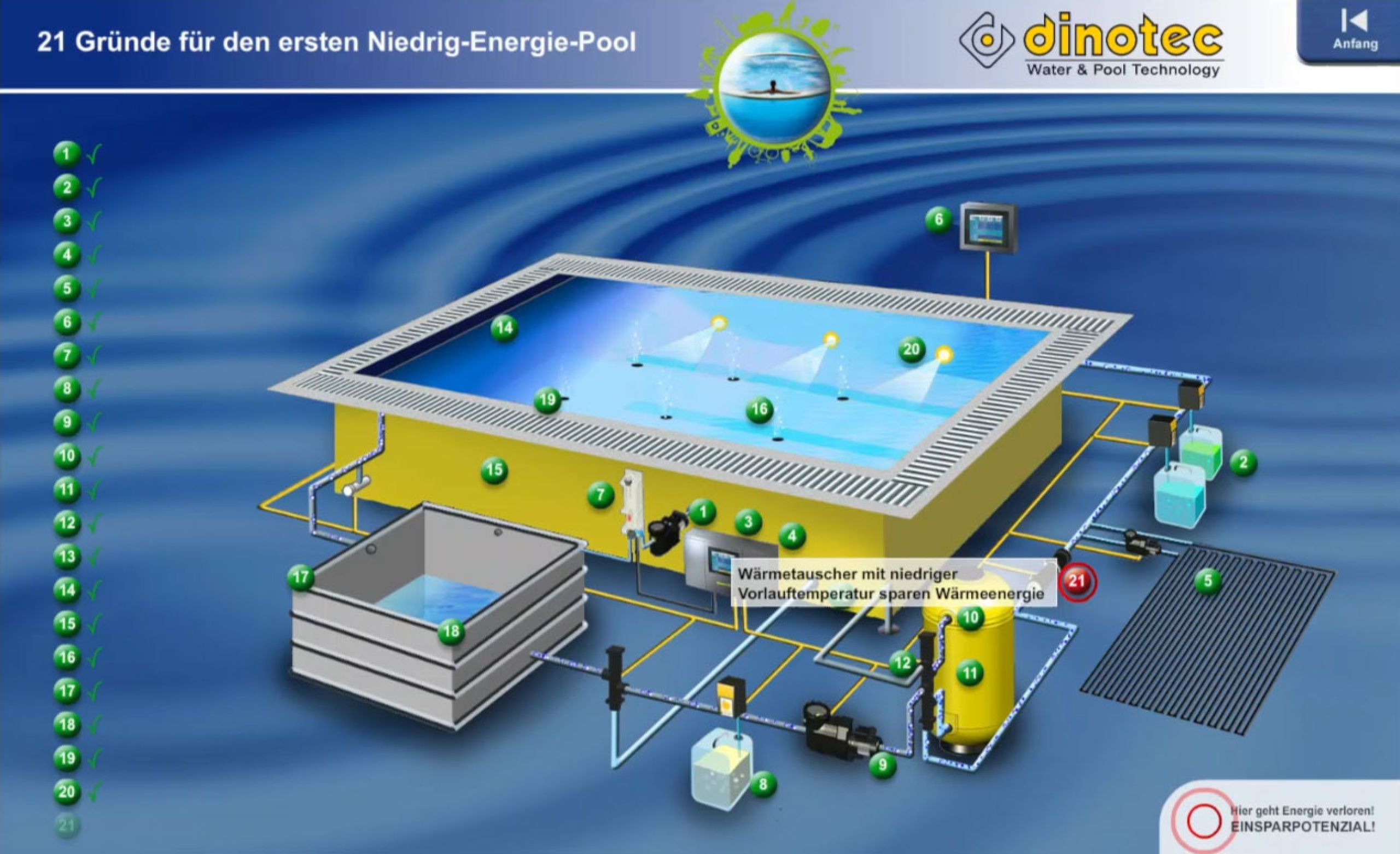 Bei herkömmlichen Pools geht eine Menge Energie verloren. Wir zeigen Ihnen, wie Sie an 21 Punkten sehr viel Energie, Wasser und Wasserpflegemittel einsparen und so zu Ihrem ersten Niedrig-Energie-Pool gelangen.