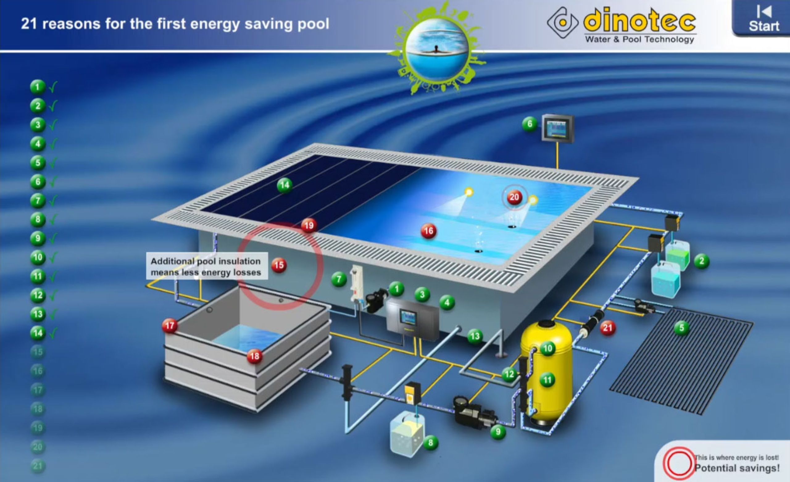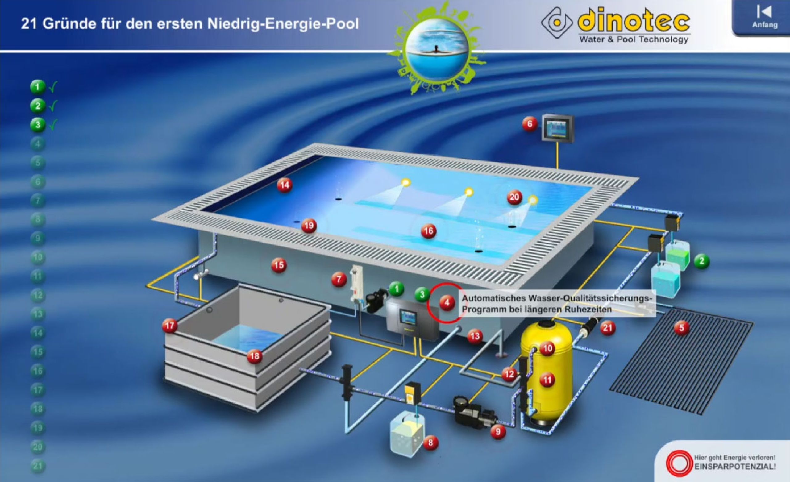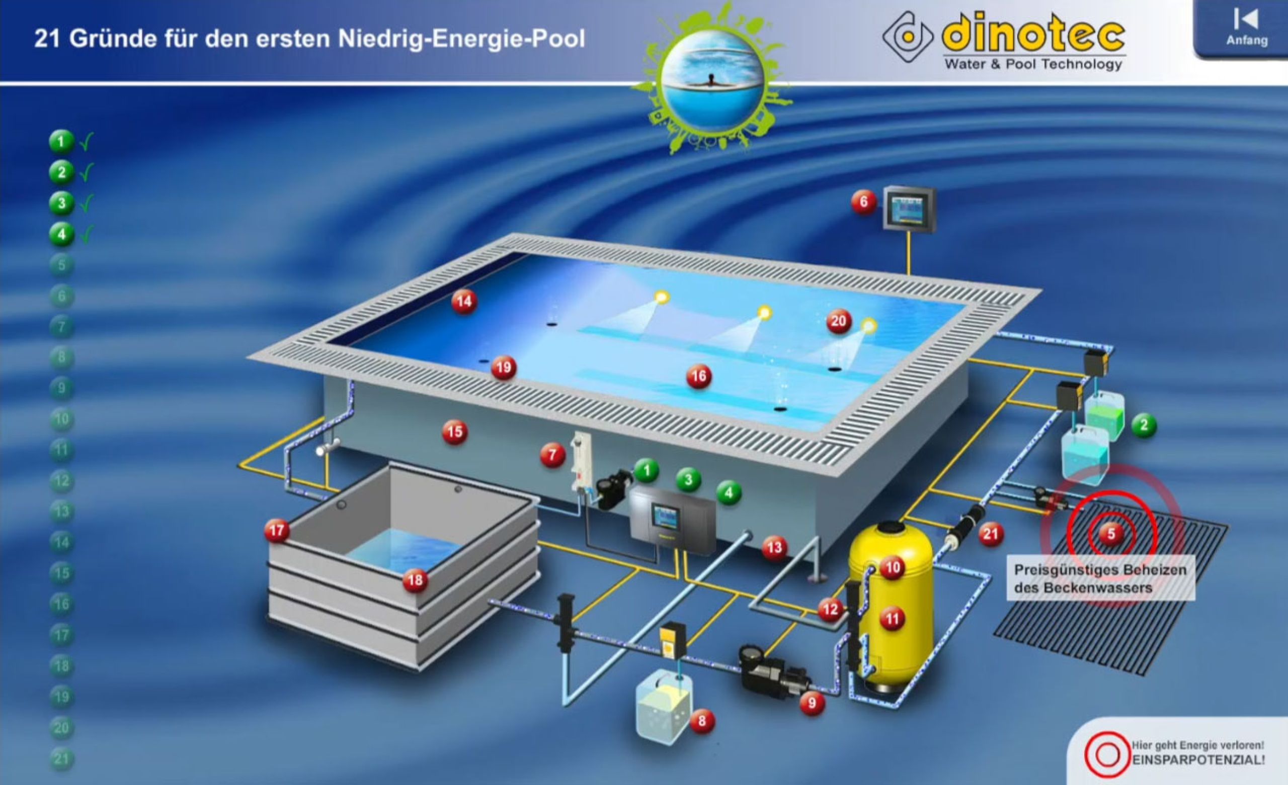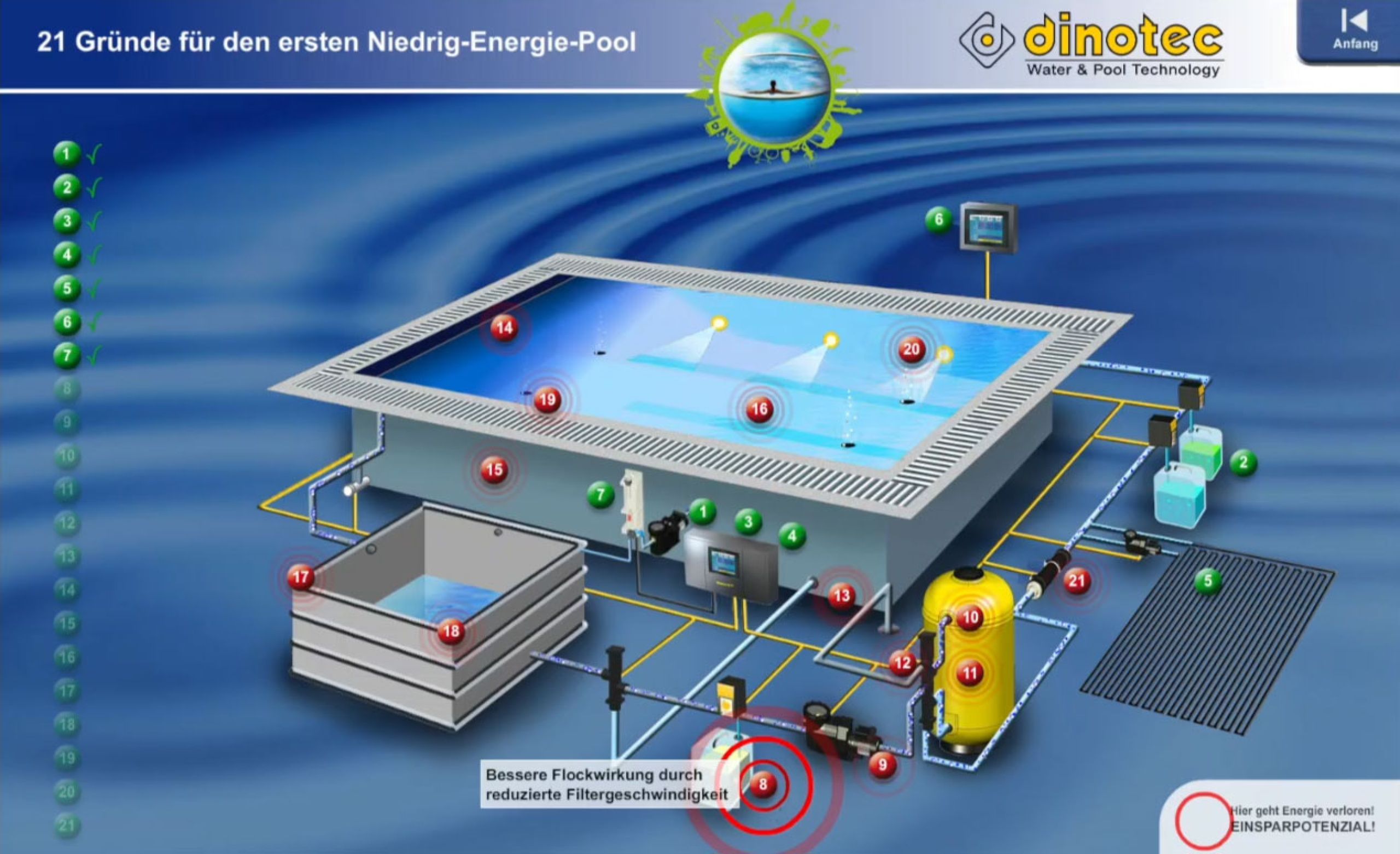 Bei herkömmlichen Pools geht eine Menge Energie verloren. Wir zeigen Ihnen, wie Sie an 21 Punkten sehr viel Energie, Wasser und Wasserpflegemittel einsparen und so zu Ihrem ersten Niedrig-Energie-Pool gelangen.