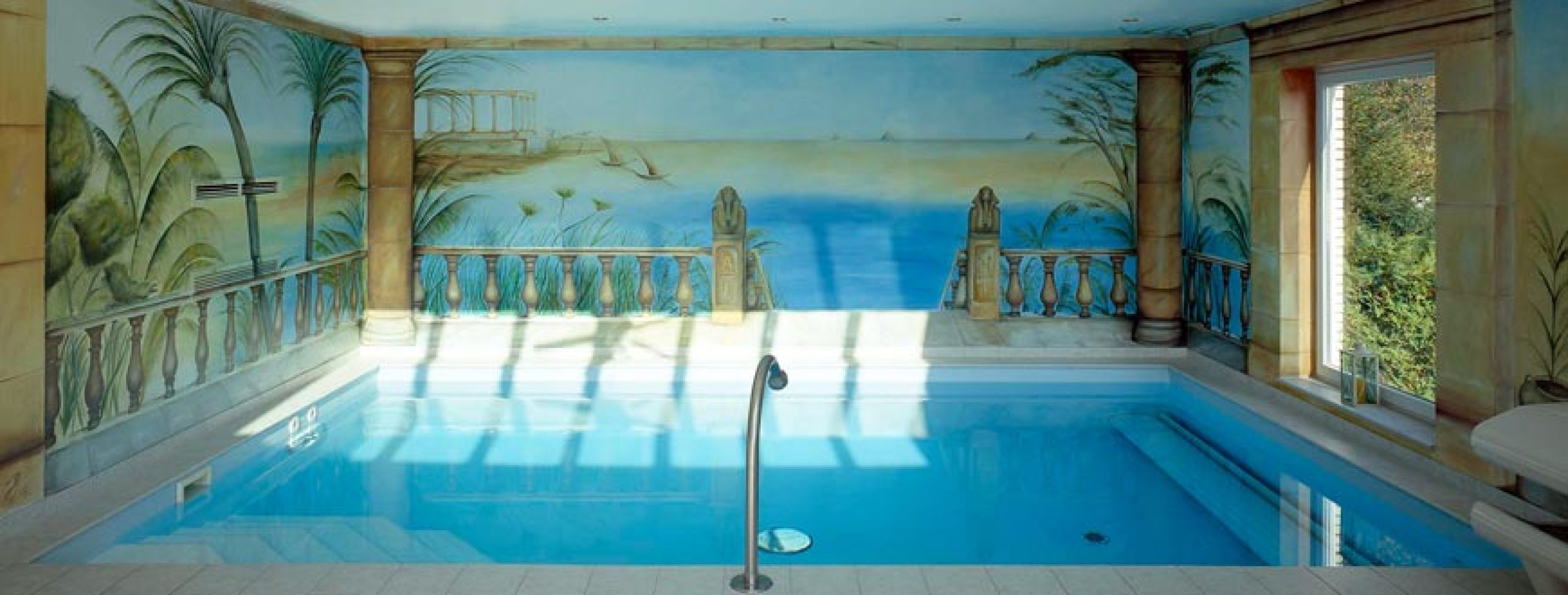 Fliesenbecken können Sie besonders schön und individuell gestalten. Durch Mosaikfliesen lassen sich verschiedene Bilder, Logos oder Familienwappen in Wände und Boden des Innenpools einlegen.