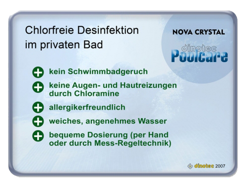 Diese sanfte Art der Wasserpflege bevorzugen vor allem Kunden, die besonders weiches Wasser lieben oder die ihren Pool besonders kinderfreundlich gestalten möchten. Auch für Allergiker und Badende mit sensibler Haut eignet sich die chlorfreie Wasserpflege mit Aktivsauerstoff besonders gut